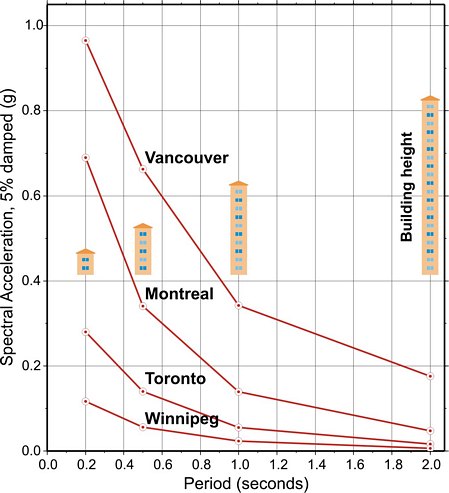 Uniform Hazard Spectra for Vancouver, Montreal, Toronto and Winnipeg at 2%/50 year probability on firm ground conditions (NBC soil class C). To interpret the spectra, consider that buildings vibrate with a resonance period (in seconds) about 1/10th their number of stories.