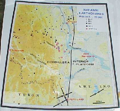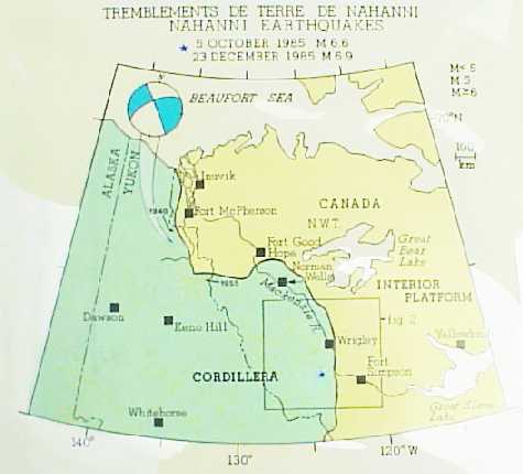 Toutefois, on connaît peu l'histoire des tremblements de terre dans le Nord canadien; ce n'est que récemment que les scientifiques ont été en mesure de déceler et de localiser des séismes de faible magnitude dans le Grand nord (fig. 1 et 2). Avant octobre 1985, on croyait que le chaînon Nahanni constituait une zone relativement exempte de séismes.