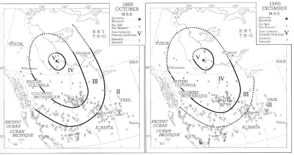 Le séisme d'octobre a été ressenti à plus de 1 500 km. La carte des isoséistes montre que l'intensité du séisme n'était pas répartie uniformément (fig. 3). Le degré IV a été signalé à au moins 1 000 km au sud-est de l'épicentre, mais seulement 500 km environ à l'ouest. À Yellowknife, qui est situé à environ 500 km à l'est de l'épicentre, l'intensité n'a atteint que le degré III. À Inuvik, qui se trouve à quelque 300 km au nord de l'épicentre, personne n'a dit avoir eu connaissance du tremblement de terre. L'étirement marqué de l'intensité dans la direction nord-ouest--sud-est, soit parallèlement à la Cordillère, caractérise également d'autres tremblements de terre dans l'Ouest canadien. L'intensité du séisme de magnitude plus élevée, survenu en décembre, était répartie à peu près de la même façon, mais les secousses ont été ressenties légèrement plus loin et des mouvements du sol ont été signalés dans le Nord-Ouest des États-Unis.