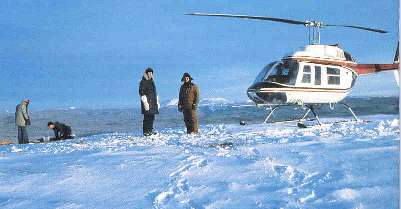 Afin de mieux connaître les causes et les effets des secousses principales, des géoscientifiques ont effectué des travaux sur le terrain immédiatement après les deux séismes. Des sismologues de la Commission géologique du Canada (CGC) et des techniciens du Centre géoscientifique du Pacifique à Sidney, en Colombie-Britannique, et de la Division de la géophysique, à Ottawa et à Yellowknife, ont effectué des levés après les deux secousses principales (fig. 4). À partir de Fort Simpson, des hélicoptères ont déployé des sismographes portatifs dans la région épicentrale. Chaque levé a duré environ une semaine. Les scientifiques ont pu maintenir en opération seulement cinq ou six stations d'enregistrement en raison des longues distances les séparant de Fort Simpson, des températures de -40C et des journées très courtes en janvier (fig. 5). Ils ont tout de même pu déterminer l'emplacement des secousses principales grâce aux sismographes et observer les effets de violents mouvements du sol au cours des levés sur le terrain.