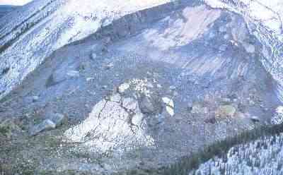 Fig 6. Éboulements Un des plus imposants éboulements survenus au Canada et le premier provoqué par un tremblement de terre: il est attribuable au séisme de Nahanni survenu le 5 octobre 1985 (Photo par R.B. Horner).