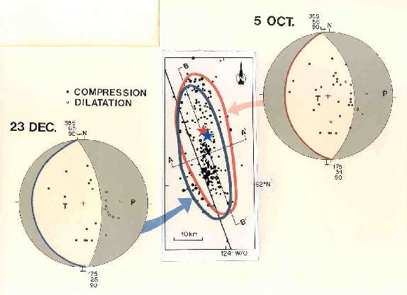 Au moyen des données provenant des réseaux sismographigues canadiens et internationaux, des sismologues d'EMR ont défini les mécanismes au foyer des deux tremblements de terre. Chacune des deux secousses principales pouvait être expliqué par deux plans de faille possibles (fig. 7). La direction des deux plans de faille possibles était presque nord-sud; l'une des failles était légèrement inclinée vers l'ouest, et l'autre avait un pendage plus prononcé vers l'est.