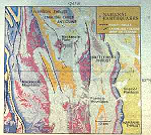Fig 8. Géologie de la région épicentrale de Nahanni Géologie de la région épicentrale de Nahanni. Les séismes se sont produits dans la plaine de Mackenzie, un plateau qui n'est presque pas déformé et est situé entre le chaînon Nahanni et les monts Mackenzie. Des carbonates et des roches détritiques, datant du Paléozoïque et du Protérozoïque, recouvrent le Bouclier canadien; elles se trouvent à une profondeur de 8 à 10 km. Cette zone a été très faillée et plissée lors de l'orogénèse laramienne; c'est à cette époque que les failles de chevauchement de Iverson, de Battlement et de nahanni se sont formées.