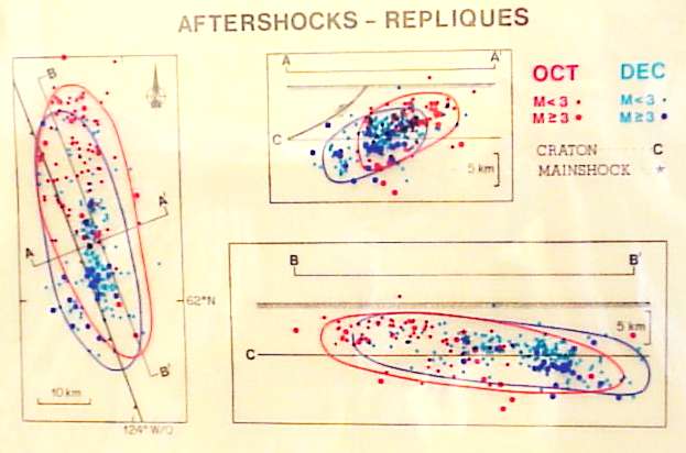 Une analyse de l'emplacement des nombreuses répliques fait ressortir les relations entre les mécanismes des secousses principales et les plus importantes failles de la région (fig. 8). Le réseau temporaire de stations portatives a enregistré un grand nombre de répliques. A partir de ces enregistrements, les sismologues ont localisé 288 répliques, qui avaient, pour la plupart, une magnitude inférieure à celle de 3,5 enregistrée en octobre 1985 et en janvier 1986 (fig. 9).